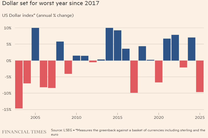 The greenback is currently on pace for a roughly 9.5% annual decline against a basket of major currencies—its most significant retreat since 2017. This downturn reflects a fundamental shift in market sentiment, as escalating trade-war anxieties have not only dampened the U.S. growth outlook but also compromised the dollar’s long-standing status as a reliable safe-haven asset.