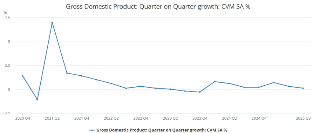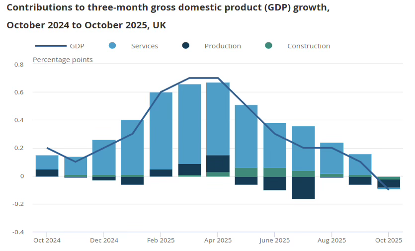 That momentum faded between December 4th and 10th, as GBP/USD entered a cautious, sideways phase ahead of the Federal Reserve meeting. Domestic data acted as a modest headwind; the ONS reported that GDP contracted by 0.1% in October, with output also declining 0.1% over the three-month period. These figures reinforced the UK’s fragile growth profile and kept the pair on the defensive as the market’s initial optimism cooled.