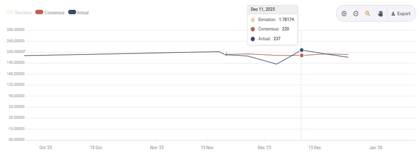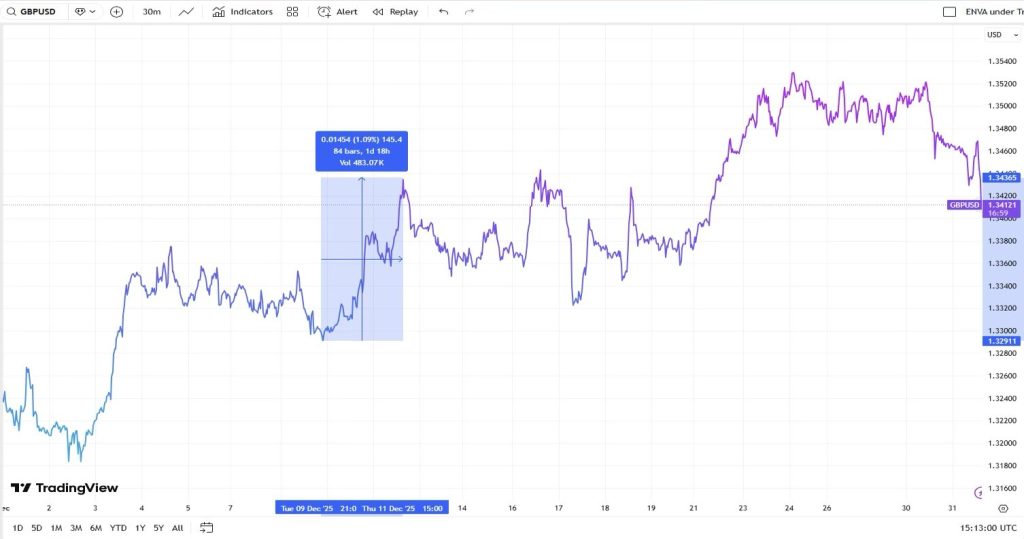 The tone shifted sharply on December 10–11 after the Federal Reserve delivered a 25bp rate cut, lowering the target range to 3.50%–3.75%. Downward pressure on the dollar intensified as weekly initial jobless claims rose to 236k—surpassing the 220k forecast—which strengthened the case that U.S. labor conditions were cooling. This data accelerated the repricing of U.S. rate support, allowing GBP/USD to break higher. The move was primarily a reflection of broad-based dollar weakness rather than a shift in underlying UK fundamentals.