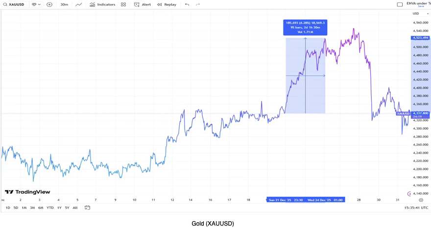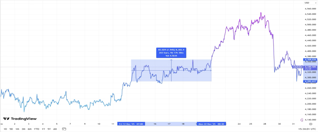 A fresh leg of the rally materialized between December 22nd and 24th, as year-end flows magnified gold’s underlying tailwinds. Market attention shifted decisively toward the 2026 outlook, with investors increasingly pricing in a prolonged Fed easing cycle. This dovish sentiment was compounded by a sharp escalation in geopolitical risk—notably following military friction and leadership upheaval in Venezuela—which steered capital away from the dollar and into safe-haven bullion. In an environment of thin holiday liquidity, these factors triggered an outsized move, briefly vaulting gold to a historic intraday peak of $4,549.71 on December 26th.