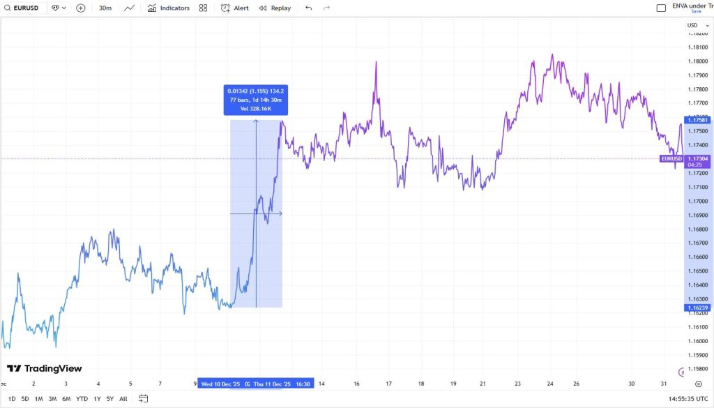 This hesitation gave way on December 10–11, when EUR/USD rallied sharply following the Federal Reserve’s third consecutive 25bp rate cut, which lowered the target range to 3.50%–3.75%. The move gained further momentum after weekly jobless claims rose to 236k (exceeding the 220k forecast). This data strengthened the perception of emerging labor-market slack in the U.S., accelerating the broad-based repricing of the dollar to the downside.