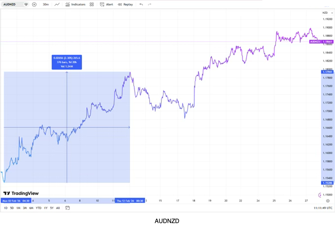 Throughout February, AUDNZD experienced a gain of roughly 2.7%, rising from the 1.155 level to finish the month near 1.188. This upward trend was fueled by an increasing policy gap between a more aggressive Reserve Bank of Australia and an unexpectedly cautious Reserve Bank of New Zealand, which provided a consistent tailwind for the pair.