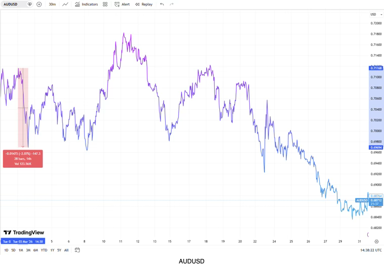 The first major setback occurred on 3 March, as the sudden “risk-off” sentiment triggered by the war in Iran hit the pair unexpectedly. As a currency highly sensitive to global risk appetite, the Australian dollar bore the brunt of the move into the US dollar. It plunged more than 2.0% in a single trading session, driven by fears of a global energy crisis following the closure of the Strait of Hormuz.