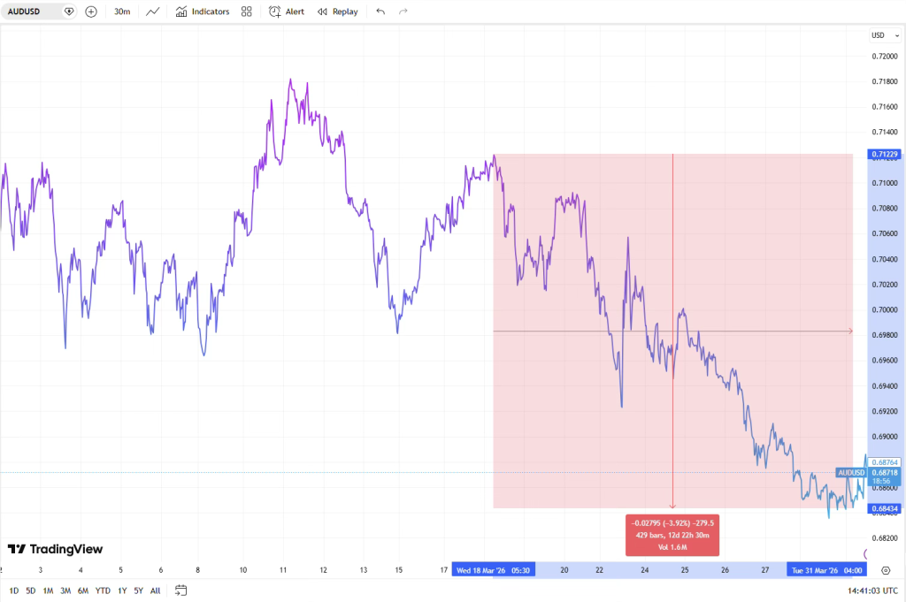 The AUDUSD pair began March trading near the 0.7100 level, supported by a hawkish Reserve Bank of Australia (RBA) and a growing interest rate advantage over the US Federal Reserve. However, it quickly encountered the most challenging macroeconomic conditions in months, finishing the month roughly 1.81% lower at approximately 0.692. This decline was fueled by a combination of safe-haven demand for the US dollar, stagnant US economic data paired with high inflation, and a cooling of the Australian economy that weakened the argument for higher rates.