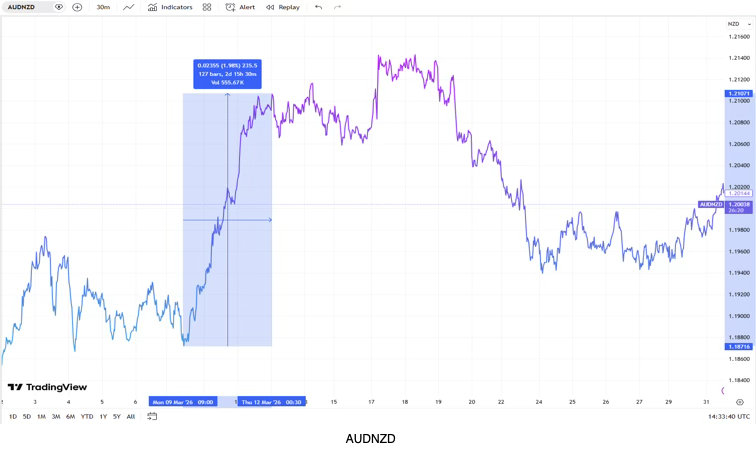 The AUDNZD exchange rate moved through March reacting to the vastly different ways the Iranian conflict affected the two neighboring Pacific nations, finishing the month with a gain of about 1.5%. This upward movement was sustained by a growing gap in economic expansion and monetary strategies between the two countries, which ultimately had a more lasting influence on the pair than the temporary market swings caused by global political instability.