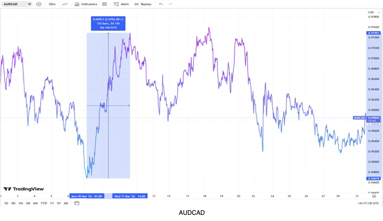 The most violent single session for the pair arrived on 23 March, when Trump’s announced pause on strikes against Iranian energy infrastructure sent crude oil collapsing more than 9%. With the Canadian dollar’s oil premium evaporating in hours, AUDCAD surged sharply on the day.