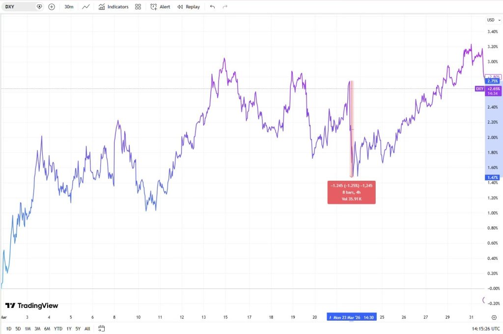 The timeframe between 15 and 23 March represented the most intense phase of the entire month. The dollar index entered this interval having hit a ten-month peak of 100.54 on 13 March, subsequently softening as market fear decreased due to rumors that the Iranian hostitilies might conclude in the near future. This decline was suddenly halted by the FOMC meeting on 18 March; while the Federal Reserve kept rates at 3.50–3.75% as anticipated, the revised economic outlook was unexpectedly aggressive, raising the 2026 inflation forecast to 2.7% and showing that seven officials now expected no rate drops this year. The greenback jumped to daily highs before reversing those gains the next day, falling under 100.00 to near 99.40 as other global central banks hinted at their own tightening, which lessened the impact of the Fed’s stance. The month’s most turbulent trading day then occurred on 23 March, triggered by Trump’s announcement that intended attacks on Iranian oil facilities would be delayed following successful diplomatic talks with Tehran.