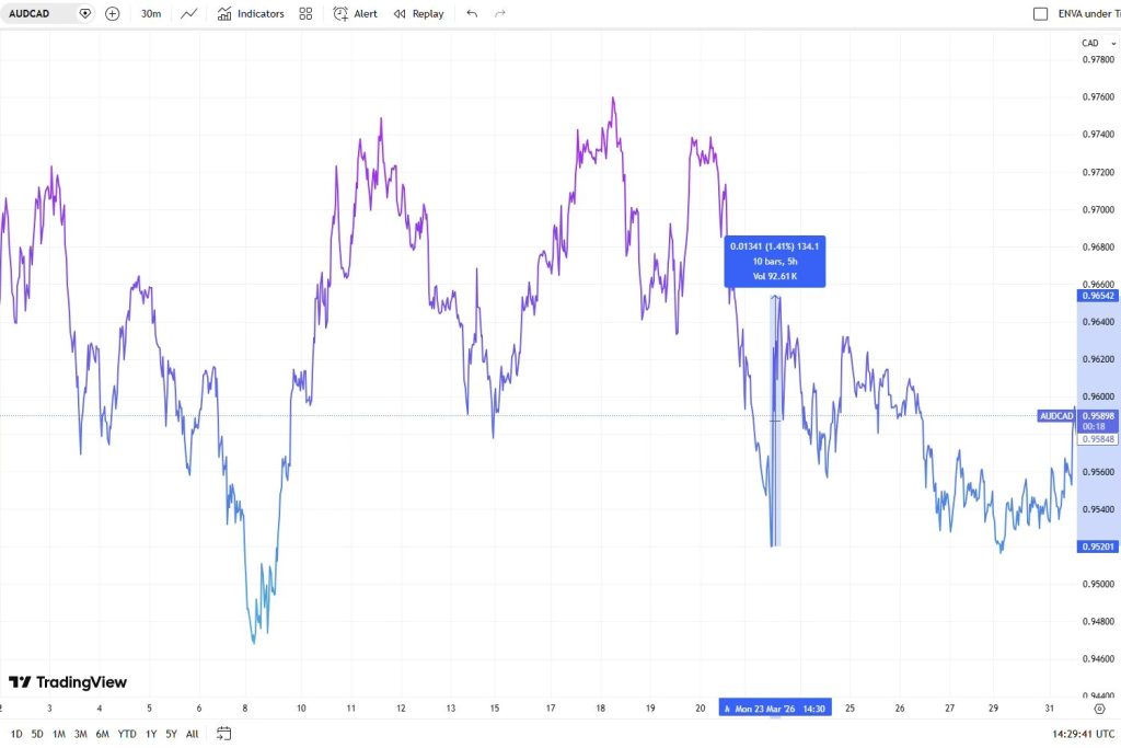 The AUDCAD exchange rate moved through March with several intense, politically motivated turnarounds, as the conflict in Iran and its differing effects on two resource-rich nations dictated the market trend. The pair started with a short-lived climb during the first two days of the month when the initial alarm over the Strait of Hormuz shutdown impacted global sentiment. This advance did not last. As the cost of crude oil accelerated toward $100 per barrel, the economic advantage swung clearly toward Canada as a primary exporter of petroleum, Canada was positioned to profit from high energy costs, leading to a stronger Canadian dollar that pushed AUDCAD through a consistent drop between 3 and 9 March.