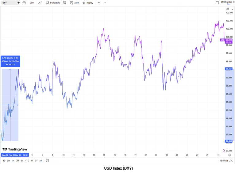 The initial move occurred between 2–3 March and left no room for doubt. Military operations by the US and Israel against Iran during the prior weekend caused the Revolutionary Guard to shut down the Strait of Hormuz – a vital passage for nearly 20% of the world’s petroleum – triggering a sudden and comprehensive rush toward secure assets. Oil costs jumped, fears regarding inflation grew stronger, and financial markets rapidly adjusted their forecasts for Federal Reserve policy by delaying the first anticipated rate reduction until July. Because the desire for safety and the fear of rising prices were aligned, the greenback climbed by almost 2% over those two days, reaching a peak of 99.22 on March 3.